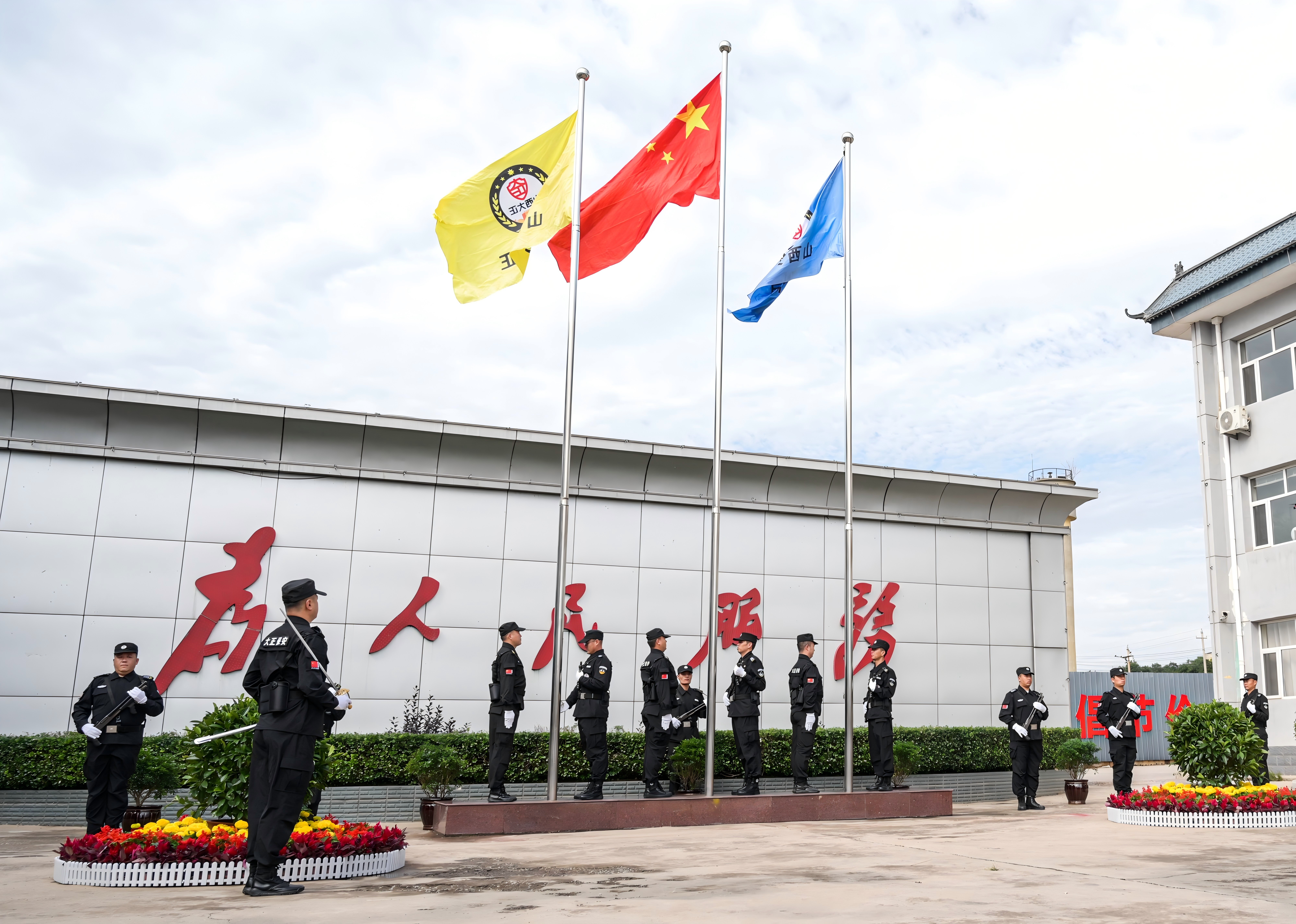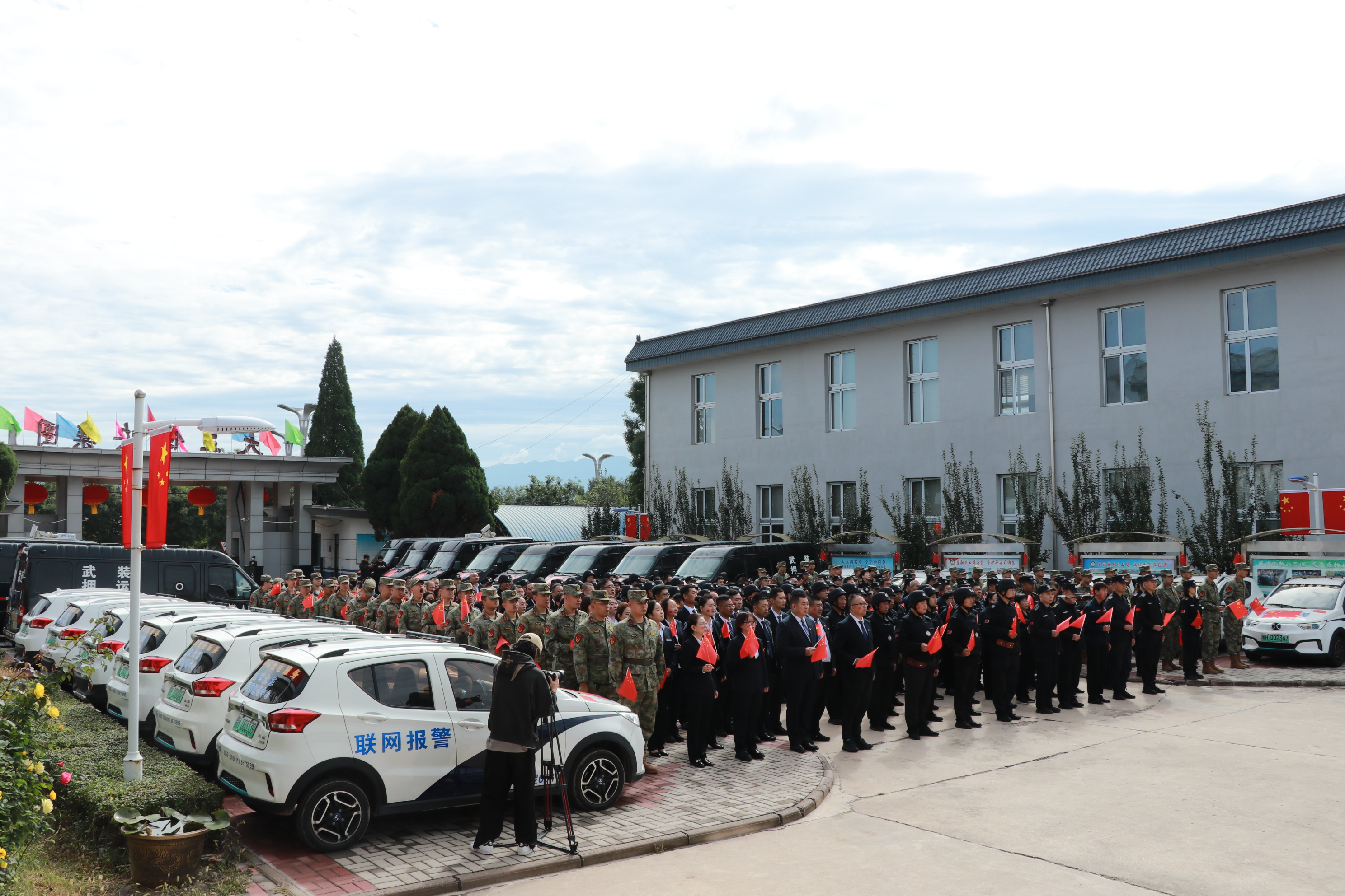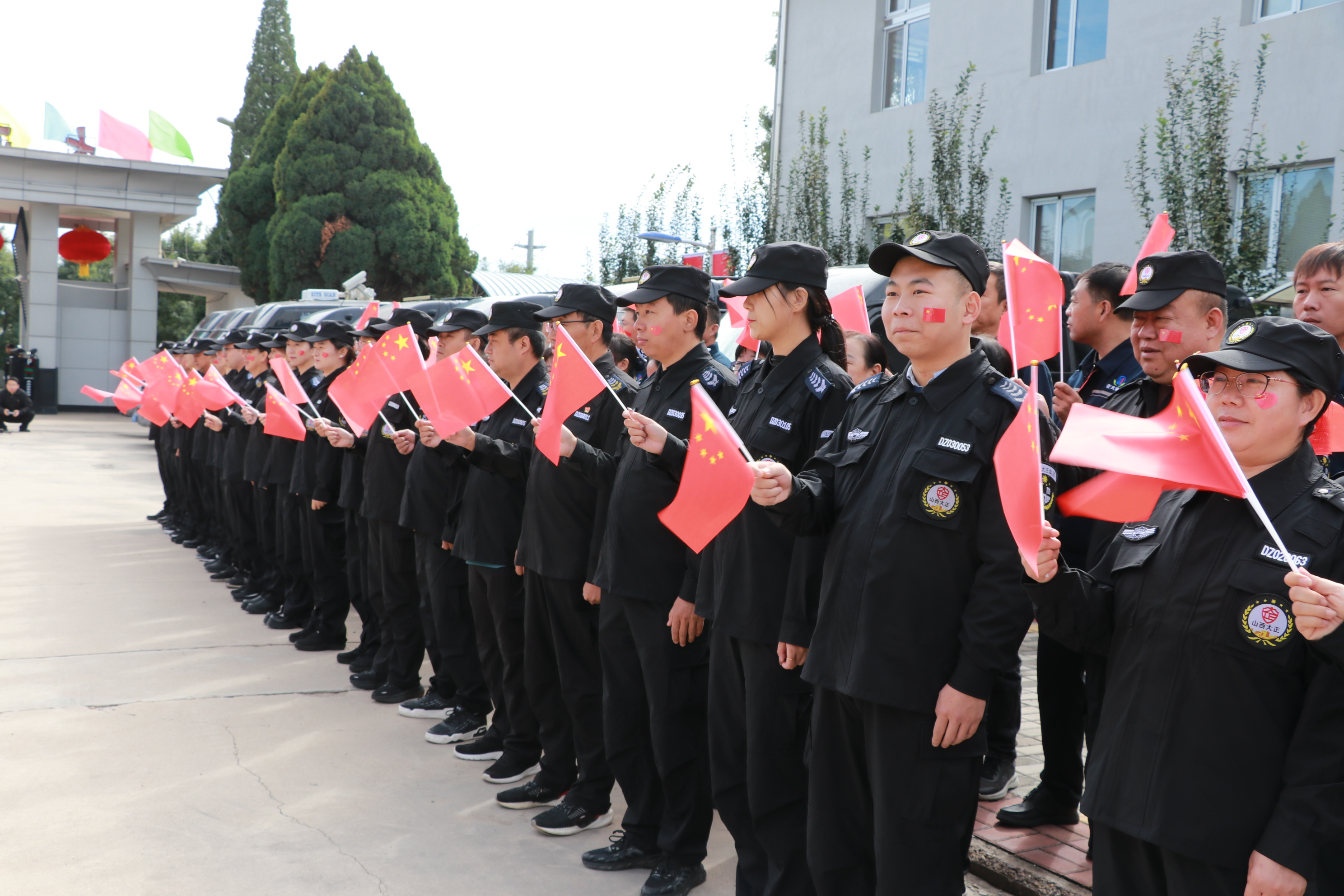 節(jié)日的公司院內(nèi)外,四周花團(tuán)錦簇,大門口燈籠高掛、彩旗飄揚,為節(jié)日增添了濃厚的喜慶氛圍。公司運鈔車、巡邏車、運兵車干凈整潔,排列在場地兩側(cè),升旗儀式更顯隆重。9時30分,集團(tuán)公司、各子公司領(lǐng)導(dǎo)和機(jī)關(guān)各部門、城區(qū)員工共300多人整齊列隊,懷著激動的心情,手持小國旗,臉上貼著愛國貼紙、洋溢幸福的笑容,眼神中充滿了對祖國的熱愛和對升旗儀式的期待。