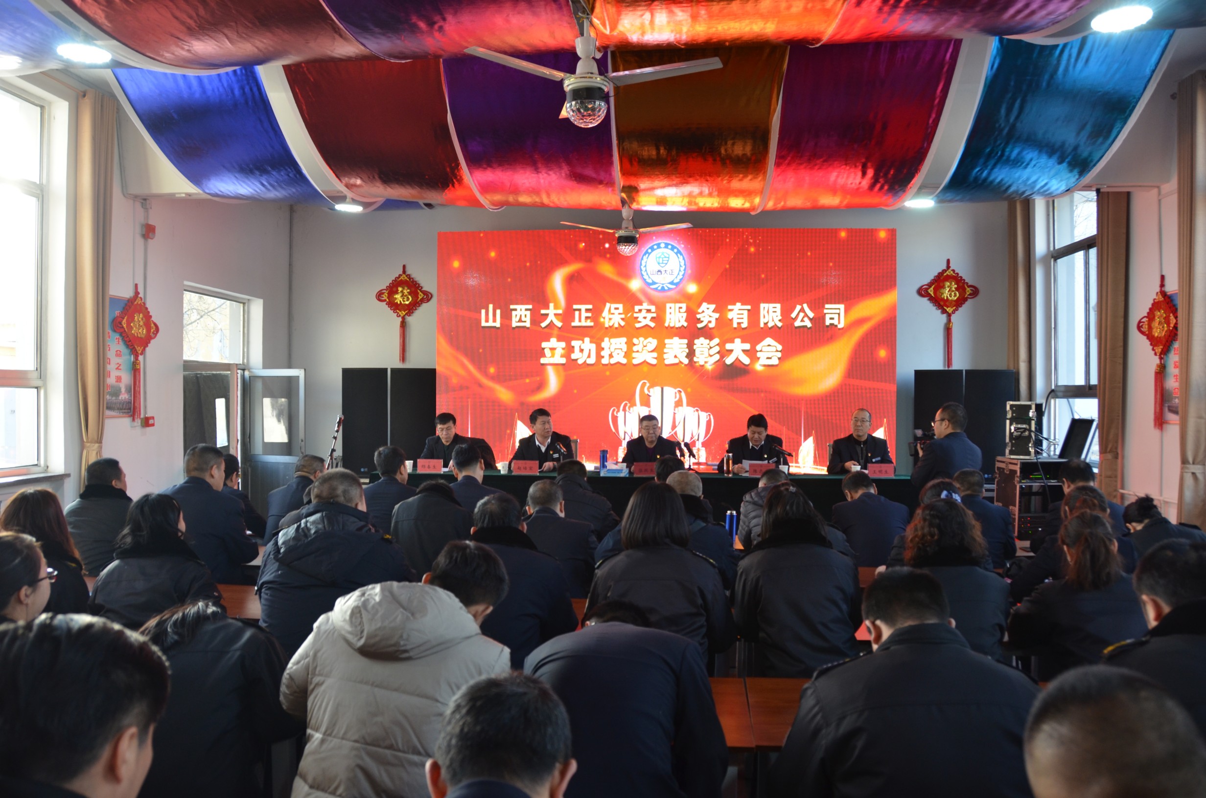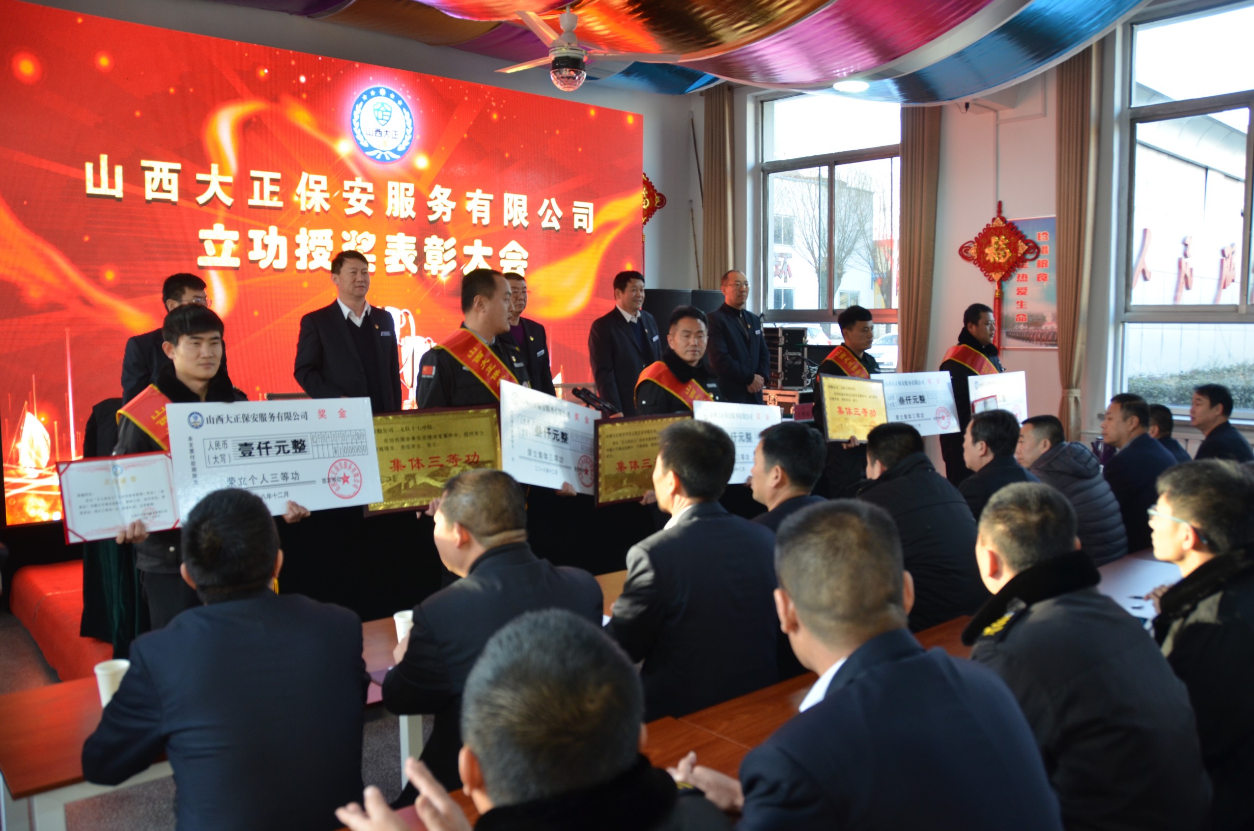 會上,黨委委員、副總經理趙培宏宣讀《山西大正保安服務有限公司關于為2018年度先進集體、個人記功的決定》。與會領導為榮立三等功的先進集體牽手平安文化藝術有限公司、忻州保安服務公司特勤公司二支隊十七中隊、忻州保安服務公司特勤公司二支隊十四中隊和榮立三等功的先進個人李振瑋、韓鑫進行頒獎。特勤公司二支隊副支隊長李濤作為立功代表進行表態(tài)發(fā)言。