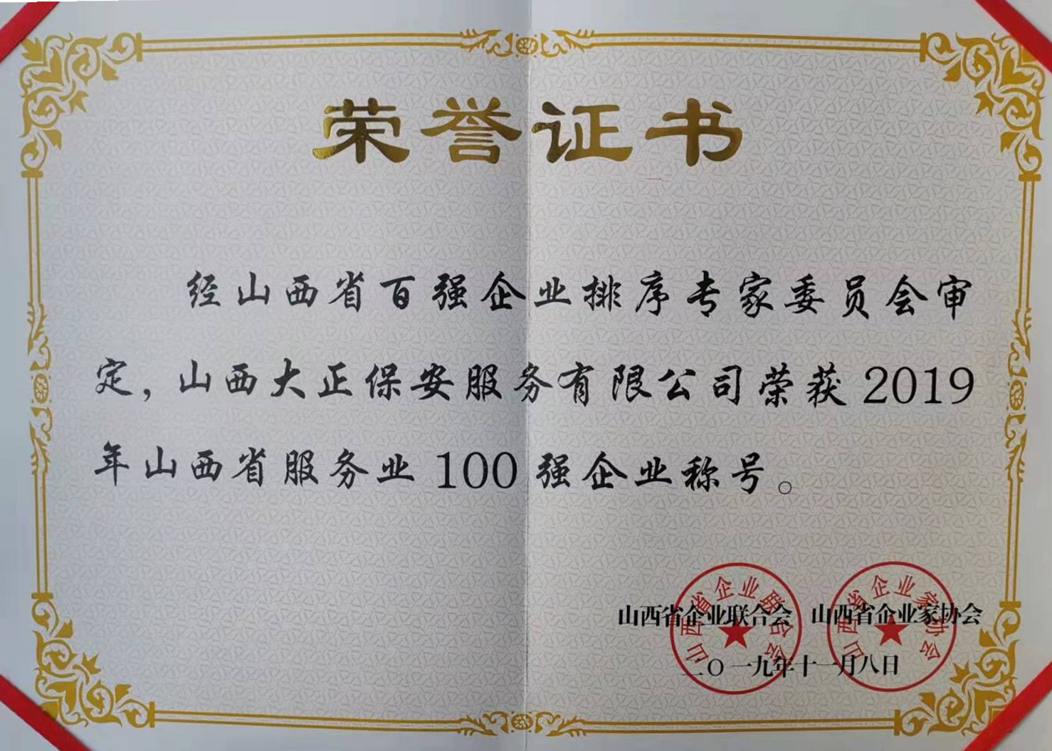 11月8日,2019山西企業(yè)100強(qiáng)在省城太原發(fā)布。經(jīng)山西省百強(qiáng)企業(yè)排序?qū)<椅瘑T會審定,山西大正保安服務(wù)有限公司再次榮獲“山西省服務(wù)業(yè)100強(qiáng)企業(yè)”,這是該公司自2014年以來連續(xù)五次榮登該榜。公司黨委副書記、副總經(jīng)理陳志平前往參會。