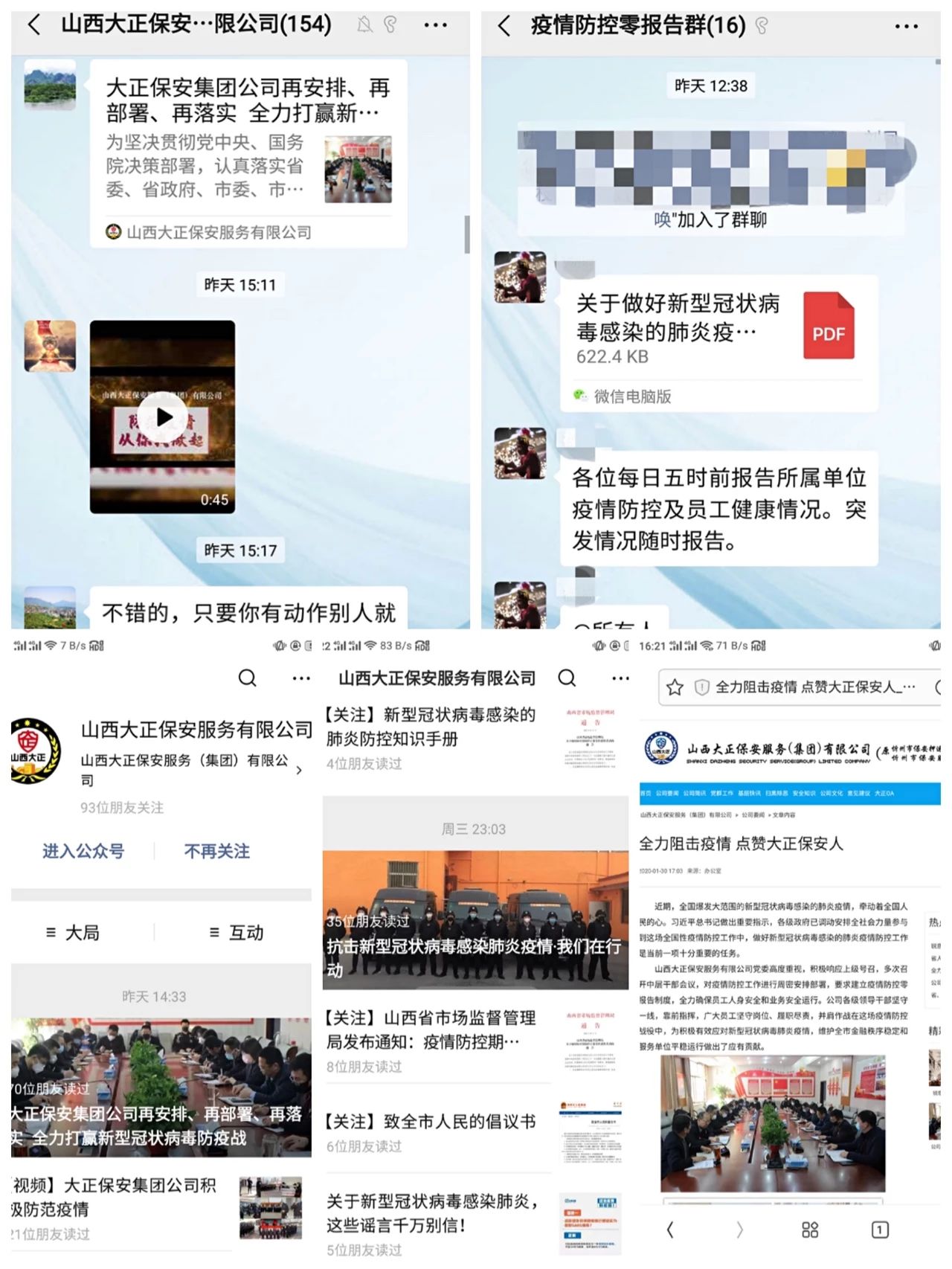 為深入貫徹習(xí)近平總書(shū)記對(duì)新型冠狀病毒感染肺炎疫情防控工作的重要指示精神,堅(jiān)決落實(shí)黨中央重大決策部署及省委、市委、市國(guó)資委部署安排,山西大正保安服務(wù)(集團(tuán))有限公司印發(fā)《關(guān)于做好新型冠狀病毒感染的肺炎疫情防控工作的通知》、《山西大正保安服務(wù)有限公司關(guān)于印發(fā)落實(shí)山西省啟動(dòng)重大突發(fā)公共衛(wèi)生事件一級(jí)響應(yīng)工作方案的通知》,要求公司各部門(mén)把防控疫情作為當(dāng)前最重要的工作來(lái)抓,落實(shí)落細(xì)防控措施,切實(shí)保障員工安全,保障全市金融秩序穩(wěn)定和服務(wù)單位平穩(wěn)運(yùn)行。集團(tuán)公司黨委印發(fā)了落實(shí)在疫情防控工作中充分發(fā)揮黨組織和黨員作用的通知,要求基層黨支部、全體黨員深刻認(rèn)識(shí)疫情防控形勢(shì),全面落實(shí)我市“五嚴(yán)五防”措施,用實(shí)際行動(dòng)踐行初心使命。