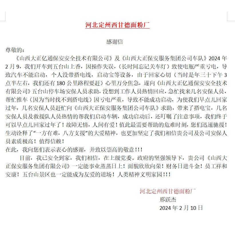 這些看似微不足道的小事,卻讓游客感受到了五臺山不僅有著豐富的文化底蘊和美麗的自然風(fēng)光,更有著溫暖人心的服務(wù)。為了表達(dá)對執(zhí)勤隊員無私幫助的感激之情,一位游客特意寫了一封感謝信,贊揚他們的專業(yè)和熱心,感謝他們?yōu)橛慰蛶淼谋憷桶残摹?/p>