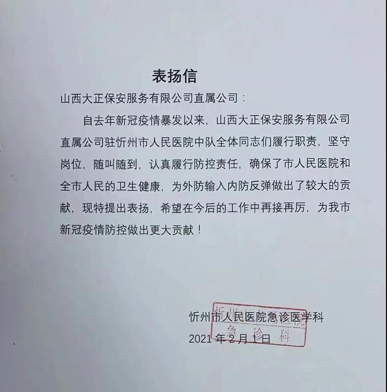 當(dāng)前,境外新冠肺炎疫情暴發(fā)增長(zhǎng)態(tài)勢(shì)仍在持續(xù),國(guó)內(nèi)疫情防控形勢(shì)依然嚴(yán)峻,尤其是近期河北、黑龍江等地發(fā)現(xiàn)新冠肺炎確診病例,給我們敲響了警鐘。山西省委、省政府高度重視疫情防控工作,明確提出要嚴(yán)格落實(shí)外防輸入措施,堅(jiān)決守住疫情防控底線。山西大正保安服務(wù)(集團(tuán))有限公司堅(jiān)持以人民利益為中心,秉承公司“服從大局、服務(wù)社會(huì)”宗旨,始終認(rèn)清疫情防控形勢(shì),堅(jiān)決克服麻痹思想和厭戰(zhàn)情緒,慎終如始、竭盡全力,緊密配合服務(wù)單位筑牢疫情防控安全網(wǎng),是國(guó)有保安企業(yè)堅(jiān)守一線,打贏疫情防控阻擊戰(zhàn)的真實(shí)寫照。