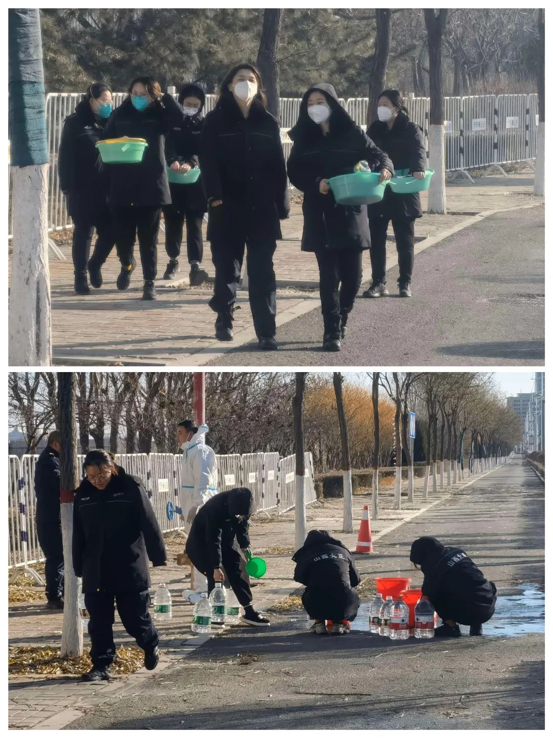 來(lái)自監(jiān)控中心的兩名男隊(duì)員張航、靳龍宇主動(dòng)承擔(dān)起了每次鉆到下水井放水的任務(wù),每到這個(gè)時(shí)候,女孩子們提著水桶、礦泉水瓶聚在消防水管下,不管水滴濺到身上還是臉上,搓著手跺著腳卻笑呵呵的打鬧著嬉戲著,緩解著疲憊,釋放著壓力……