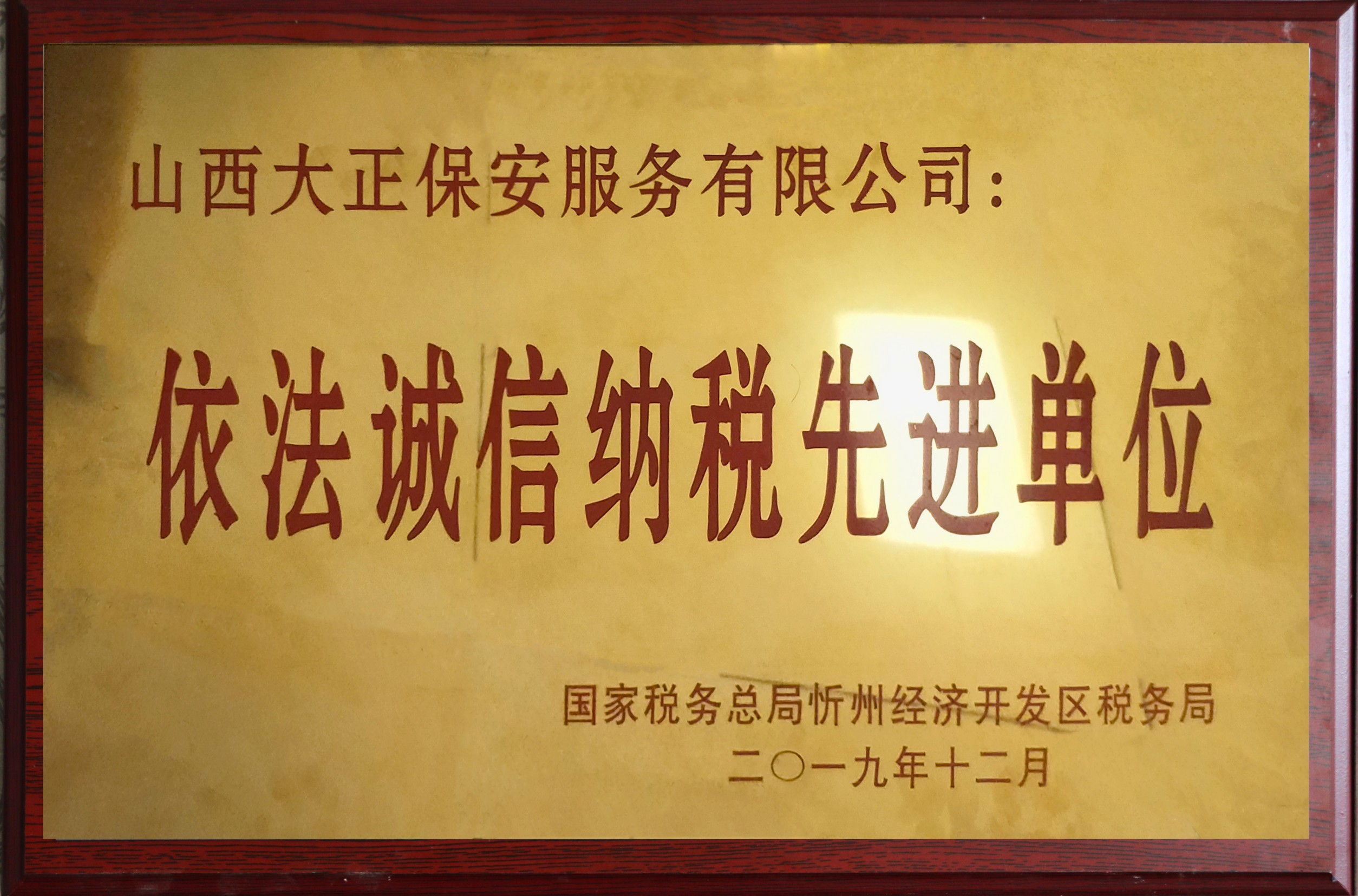 12月15日,國家稅務(wù)總局忻州經(jīng)濟(jì)開發(fā)區(qū)稅務(wù)局舉行2019年度“依法誠信納稅先進(jìn)單位”頒獎(jiǎng)儀式。山西大正保安服務(wù)(集團(tuán))有限公司等9家企業(yè)榮獲2019年度“依法誠信納稅先進(jìn)單位”稱號。集團(tuán)公司黨委委員、副總經(jīng)理趙培宏代表公司參加儀式并上臺領(lǐng)獎(jiǎng)。