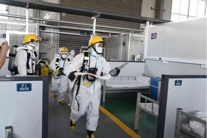 上午8點(diǎn)30分,隊(duì)員們準(zhǔn)時(shí)抵達(dá)忻州市方艙醫(yī)院,對(duì)方艙醫(yī)院滅火器、水閥、消防槍頭、消防水帶等所有消防設(shè)施進(jìn)行了全面的檢查。在炎炎夏日30度的高溫天氣下,隊(duì)員們不僅穿著消防服,還需加套醫(yī)用防護(hù)服,每次穿著脫下來時(shí)都是汗流浹背把衣服都浸濕了,但隊(duì)員們一次又一次的努力掌握如何正確、快速完成穿著練習(xí),大家不急不躁,情緒始終高漲。